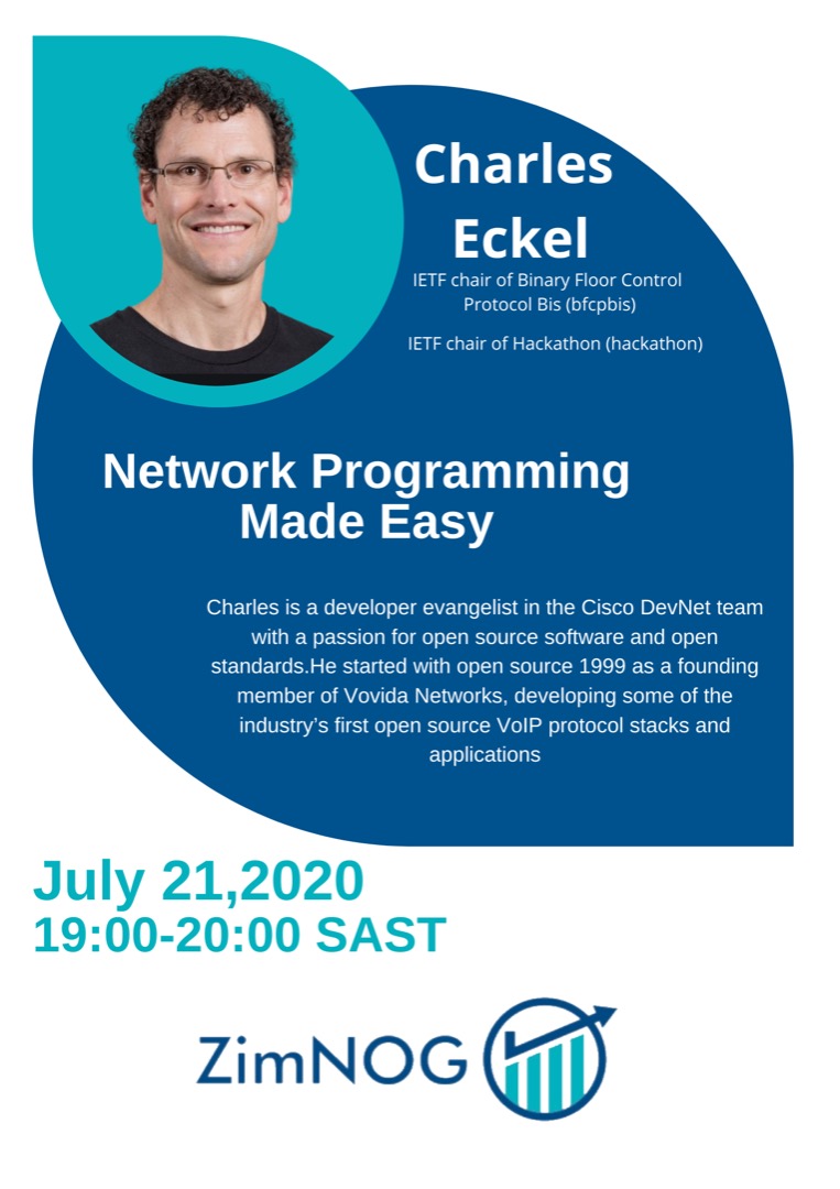 Most of us will remember Charles from the numerous IETF/AIS hackathons .ZimNOG is proud to virtually have him back in Africa & in a NOG community as he presents Network Programming Made Easy